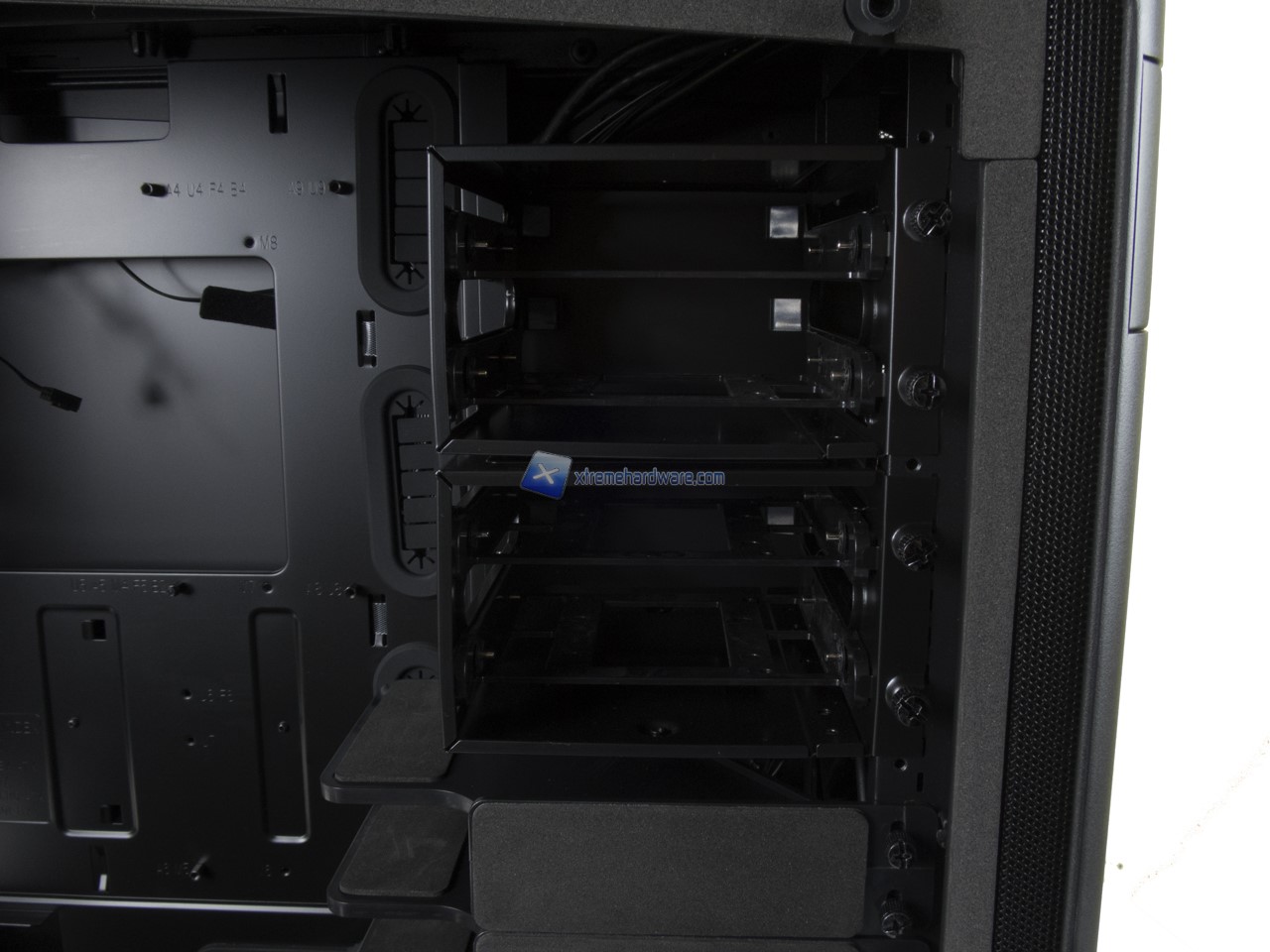 Noterete anche come tutti i supporti o Cage che essi siano sono tenuti in sede da una serie di viti Tool-Less. Questo ci permetterà di rimuovere il superfluo per la nostra configurazione e ottimizzare gli spazi e alloggiamenti. Osservare anche come a lato Tray avremo una serie di fori, come visto per i Cooler Master MasterCase 5 e Pro.
