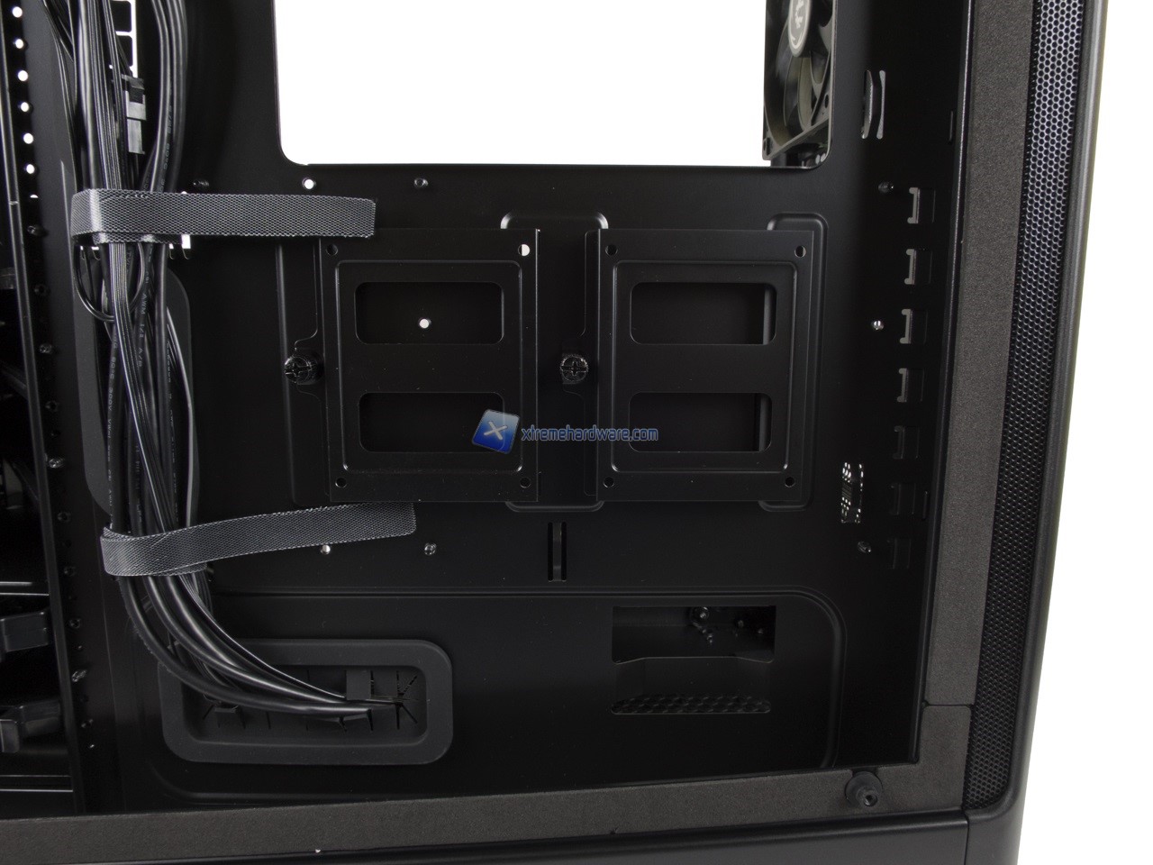 Ora non ci resta che dare uno sguardo al lato posteriore. Osserviamo il generoso e classico foro nel Tray con cui potremo installare i backplate dei dissipatori anche a seguire oltre a due slitte per SSD. Giusto per non farsi mancare alcuna possibilità di organizzazione e cablaggio ottimale.