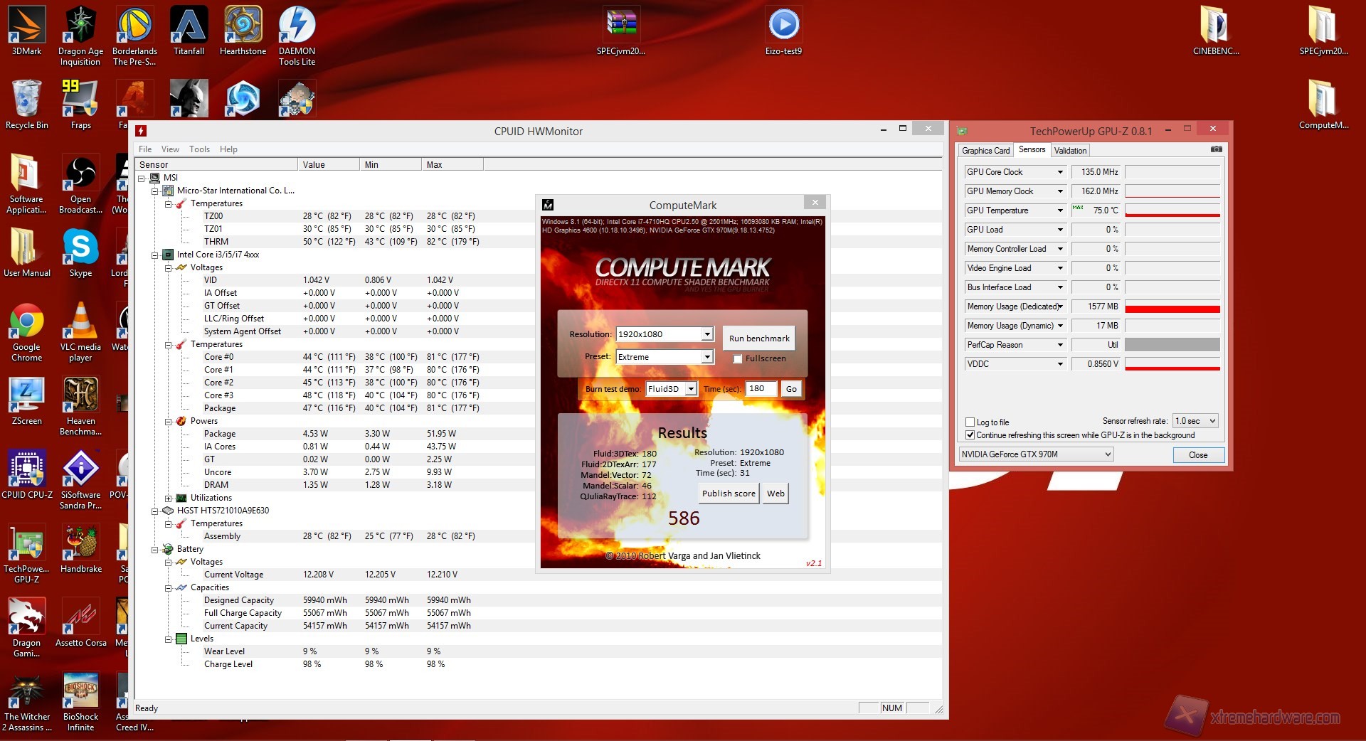 Il picco massimo registrato dalla CPU è stato di 81°C mentre per quanto riguarda la GPU abbiamo raggiunto i 75 gradi Celsius.